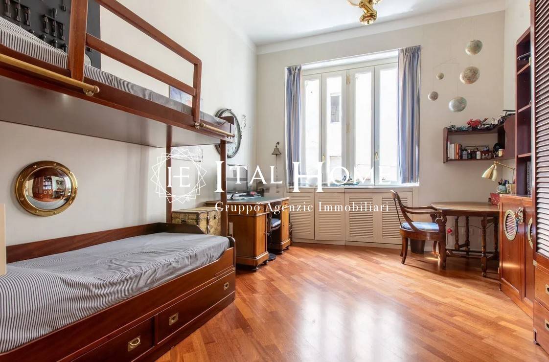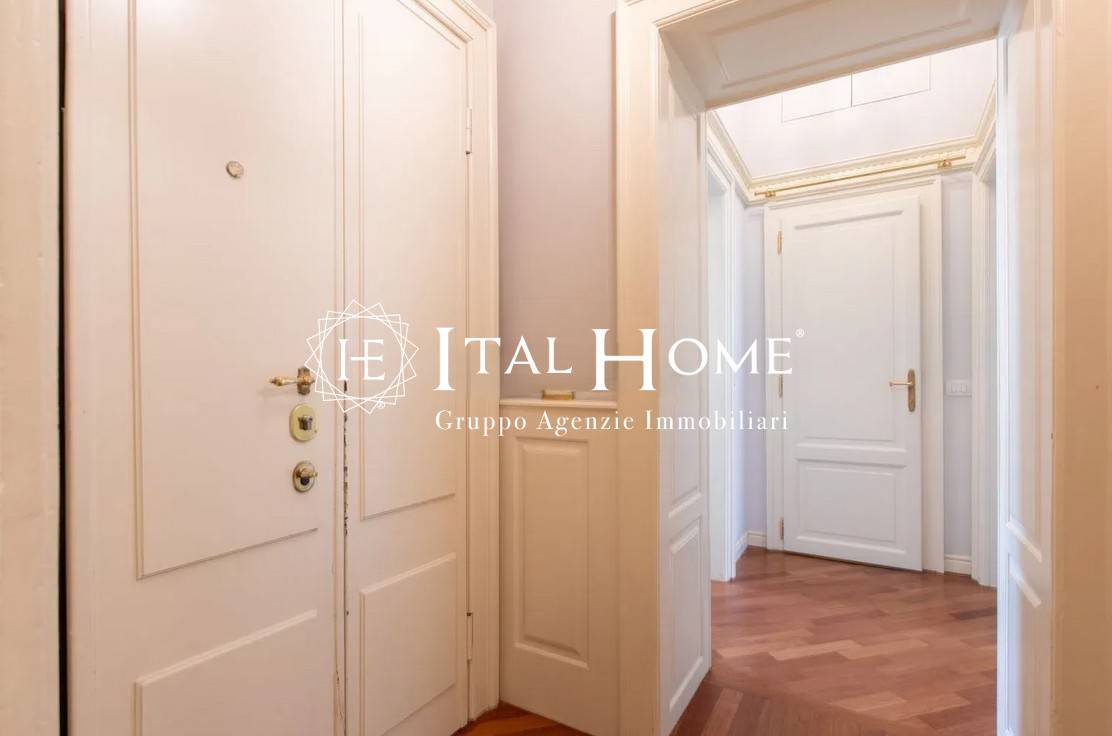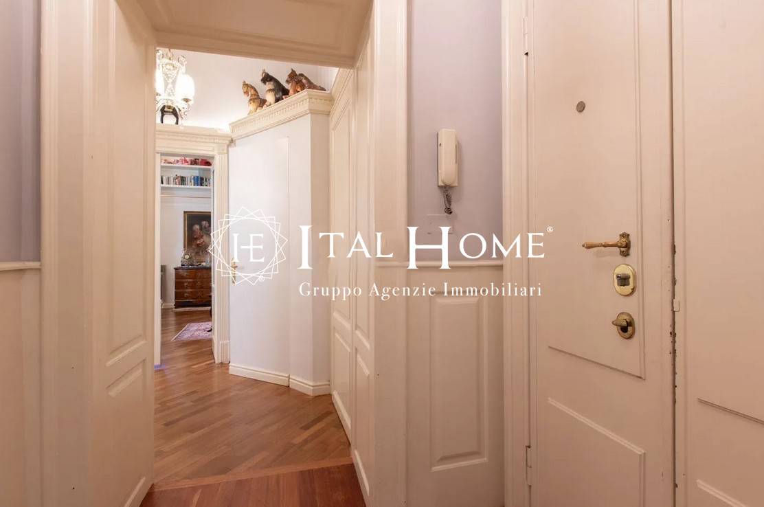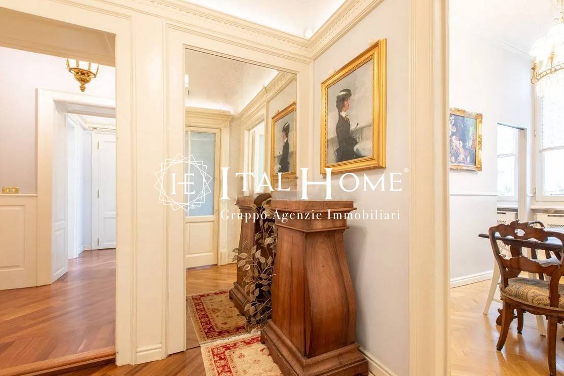 L'appartamento, progettato ed arredato su misura, gode di una metratura invidiabie perfettamente suddivisa in spazi al tempo stesso funzionali ed eleganti: boiserie nell'ingresso, accogliente soggiorno con caminetto d'epoca funzionante, fornitissima cucina abitabile, ampia sala da pranzo separata, tre comfortevoli camere da letto, ulteriore stanza studio, due raffinati bagni di rappresentanza, di cui uno dotato di lussuosa vasca idromassaggio, pratico ripostiglio, utilissima area lavanderia, ed infine persino due ripostigli aerei.